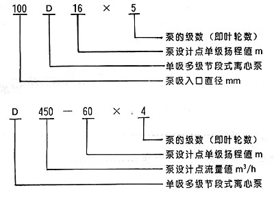 注:D(DF多級耐腐蝕離心泵、DY多級離心油泵、MD多級耐磨離心泵)80-30為習慣表示方法,其中80表示泵吸入口直徑為80mm,30表示泵設計點單級揚程為30m,其它含義與上述表示方法相同。