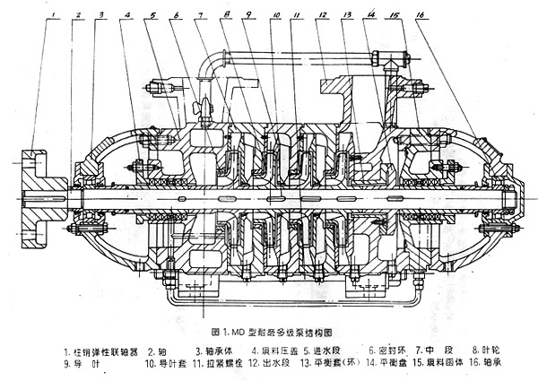 MD系列泵系臥式、單吸、分段式多級離心泵,吸入口為水平方向,吐出口與水平垂直向上。泵的進水段、中段、出水段、軸承體待泵殼體部分通過拉緊螺栓聯成一體,并根據泵的揚程選擇泵的級數。