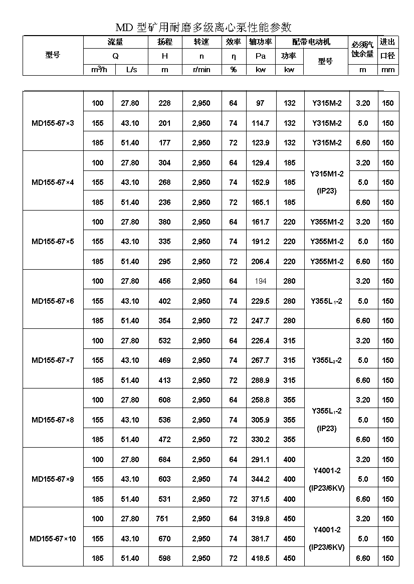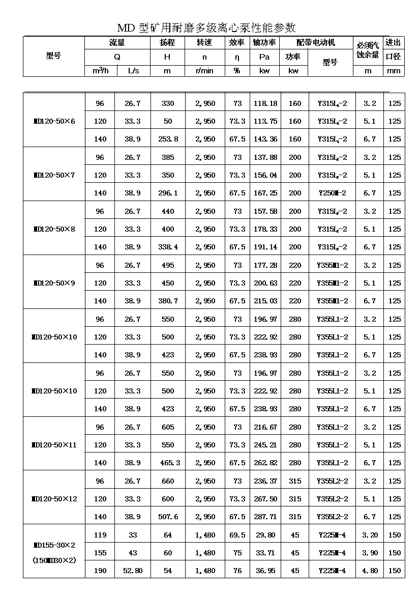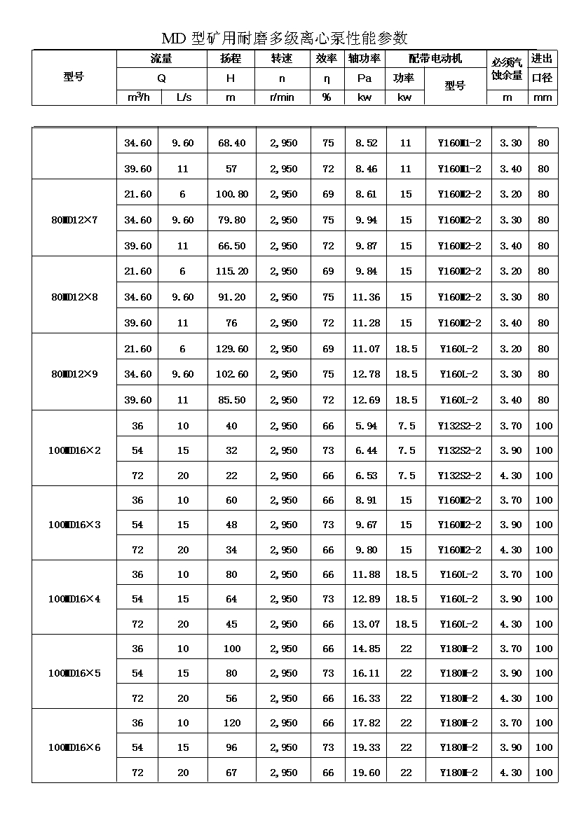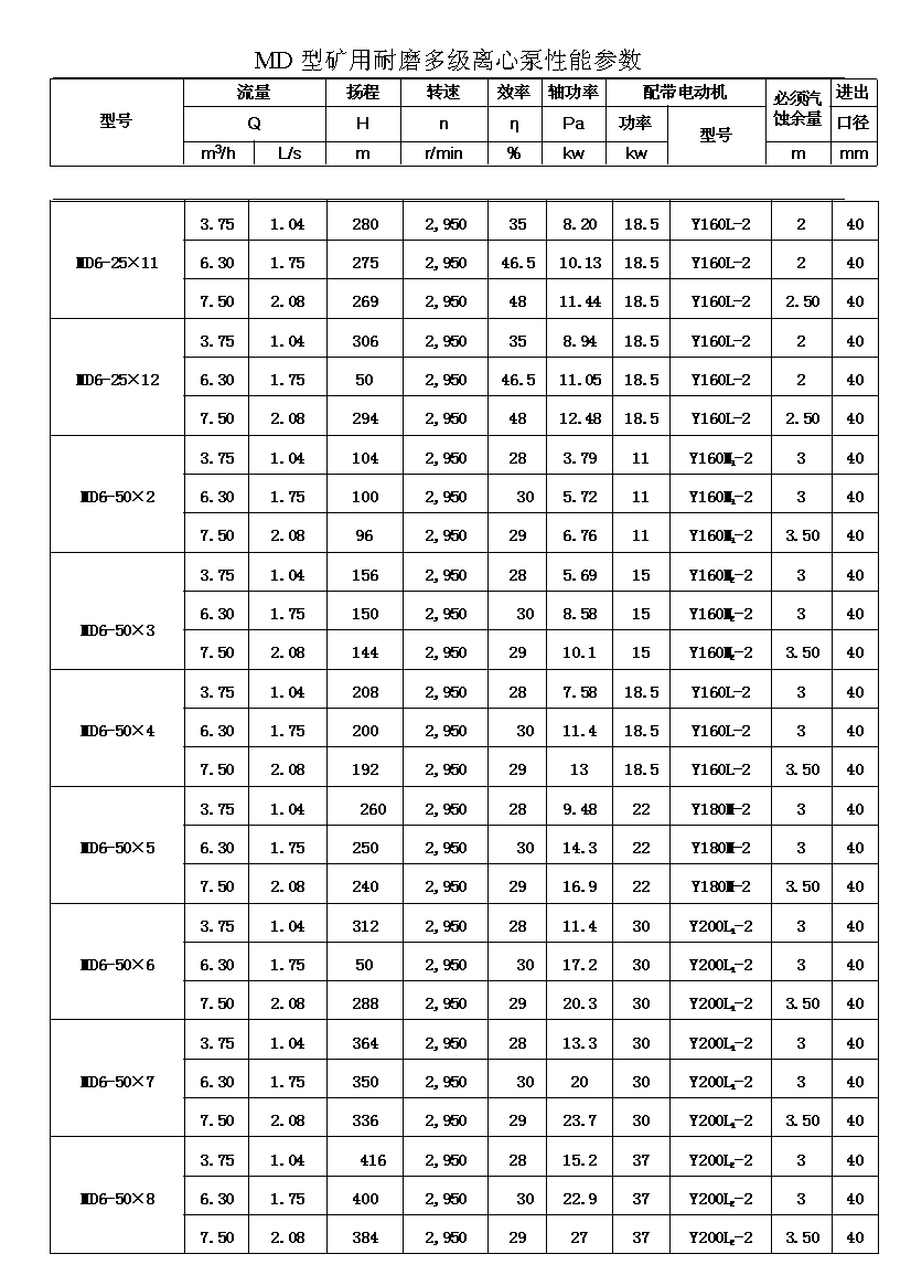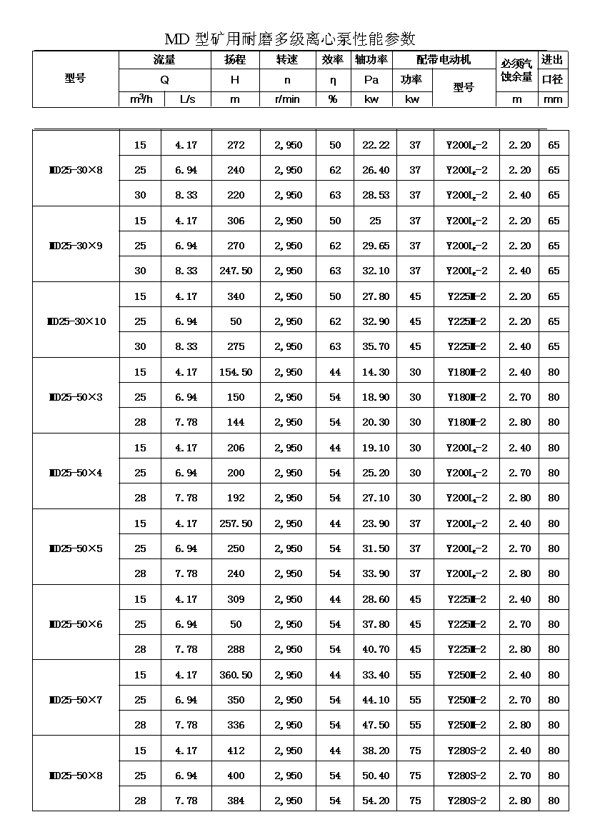 MD型耐磨多級離心泵,是我公司在D型單吸多級清水離心泵的基礎上,改造設計的一種耐磨多級離心泵。MD型耐磨多級離心泵,高效節能,耐磨可靠,壽命長, 特別適用于礦山排水,抽送固體顆粒含量不大于1.5%(顆粒直徑小于0.5毫米)的礦井水及其他類似液體,液體溫度不高于80度。