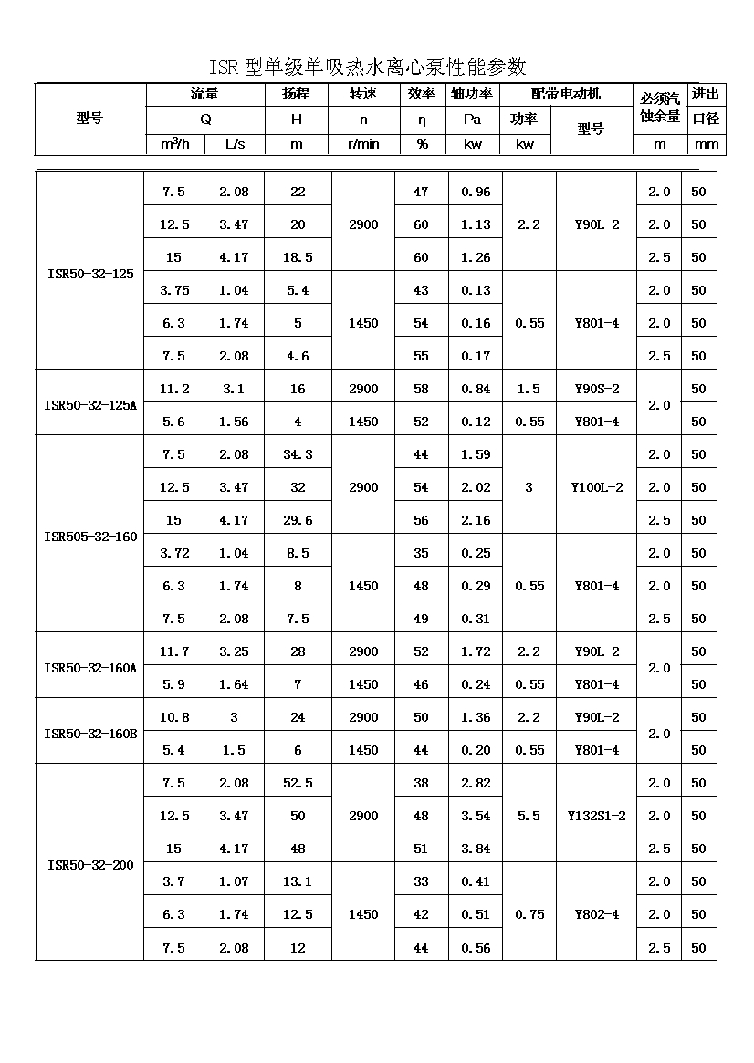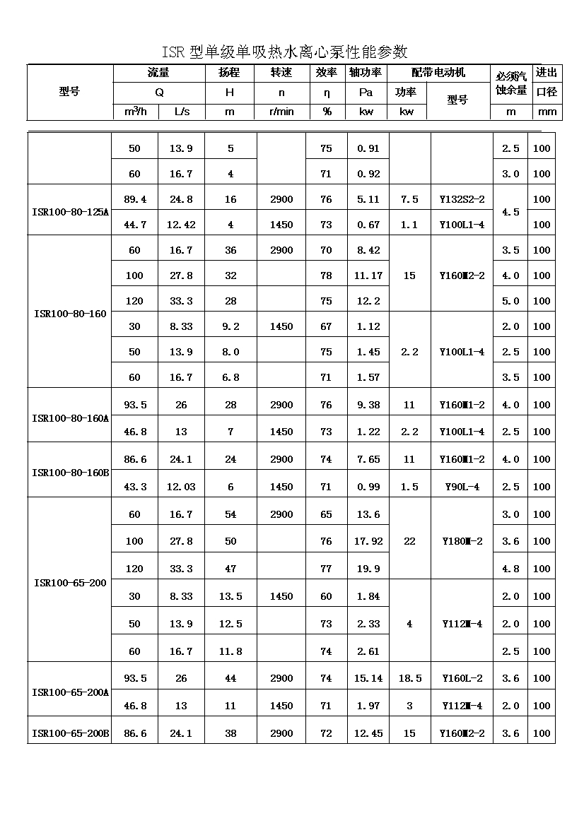 ISR系列單級單吸熱水離心泵共有二十九種基本型,為滿足用戶對泵的不同性能要求,我廠采用了切割葉輪外徑的方法,從而增多了ISR泵的規(guī)格。